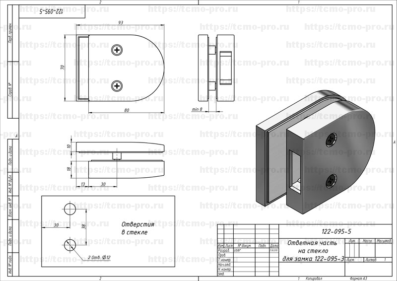Ответная часть с притвором для стеклянных дверей. Устанавливается на неподвижное стекло и позволяет использовать замок 122-095-3 без дверной коробки.