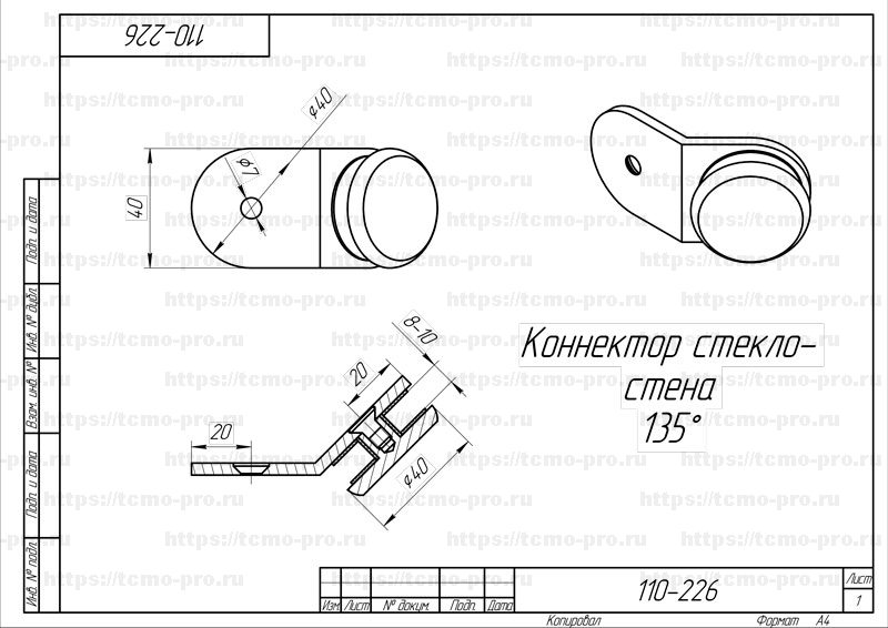 Коннектор предназначен для крепления стеклянной перегородки душевой кабины к стене под углом 135º. Соединение со стеной выполняется через одно отверстие. Изготовлен из цинкового сплава с качественным покрытием. Круглая форма крышки позволяет использовать уплотнитель без разреза.