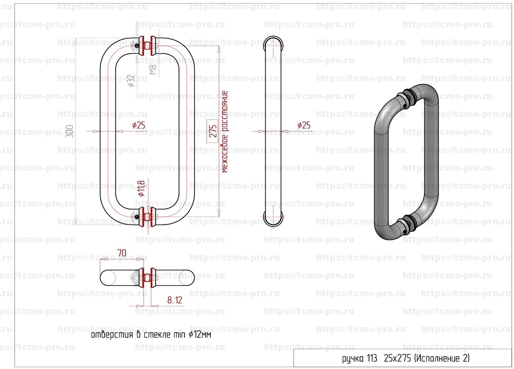 Ручка-скоба двухстороняя для стеклянных дверей душевых кабин, офисных дверей, входных групп. Отверстия в стекле Ø10-12 мм, межосевое расстояние 275 мм.