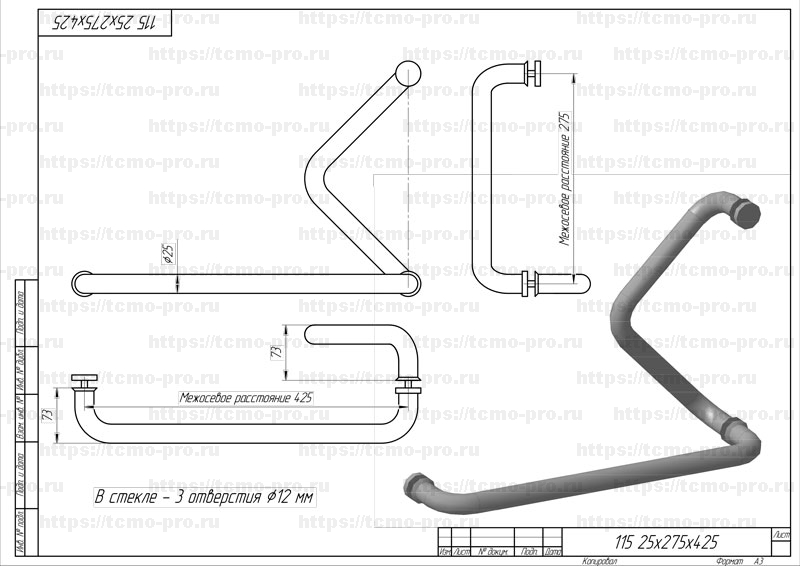 Ручка-скоба для душевых кабин из стекла. Может использоваться в качестве полотенцесушителя. Обычно короткая изогнутая часть устанавливается внутри душевой кабины вертикально, а длинная часть — снаружи горизонтально. Межосевые расстояния 275 мм и 425 мм соответственно. Отверстия в стекле 10-12 мм.