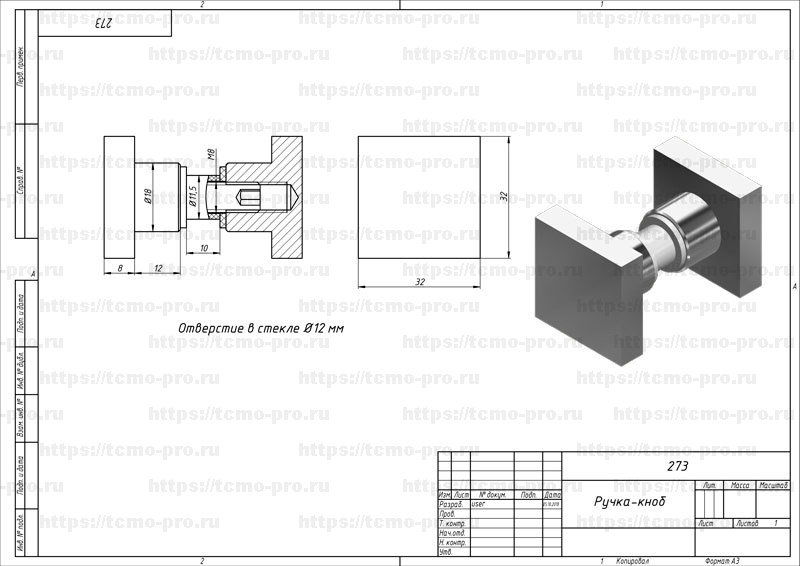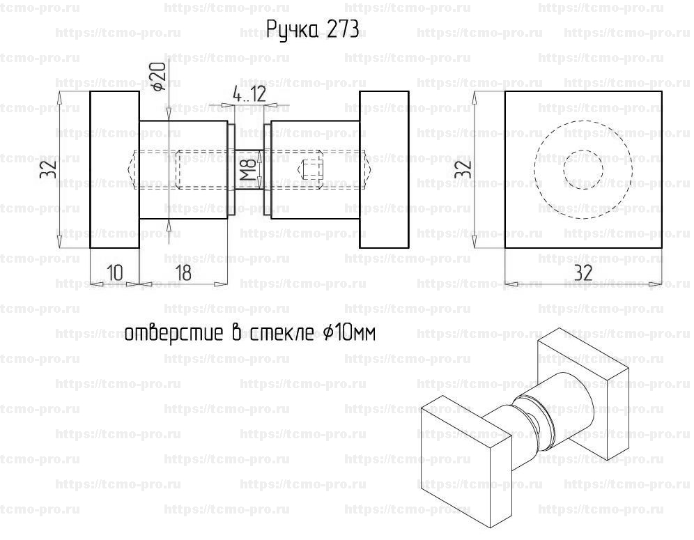 Ручка-кноб квадратной формы. Предназначена для стеклянных дверей толщиной 6-12 мм. Отверстие в стекле Ø12 мм.