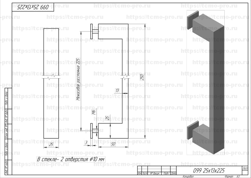 Ручка-скоба односторонняя. Может применяться в душевых кабинах из стекла толщиной 8-10 мм. Отверстия в стекле Ø 8-10 мм, межосевое расстояние 225 мм.