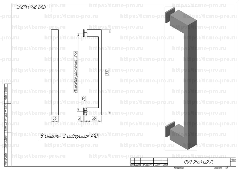 Ручка-скоба односторонняя. Может применяться в душевых кабинах из стекла толщиной 8-10 мм. Отверстия в стекле Ø 8-10 мм, межосевое расстояние 275 мм.