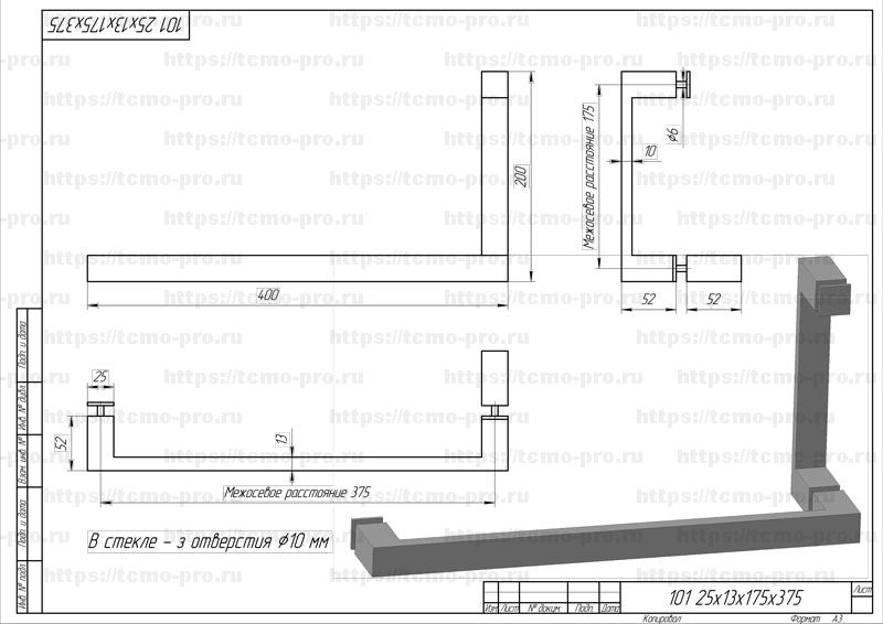 Ручка-скоба двухсторонняя для душевых кабин из стекла. Может использоваться в качестве полотенцесушителя. Обычно короткая часть устанавливается внутри душевой кабины вертикально, а длинная часть — снаружи горизонтально. Межосевые расстояния 175 мм и 375 мм соответственно. Отверстия в стекле 10-12мм.