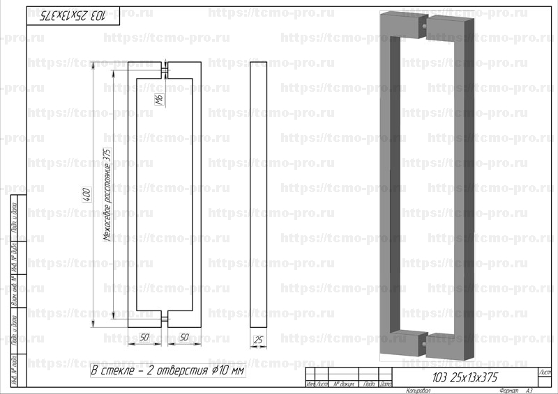 Ручка-скоба двухсторонняя для стеклянных дверей душевых кабин. Отверстия в стекле Ø10-12 мм, межосевое расстояние 375 мм.