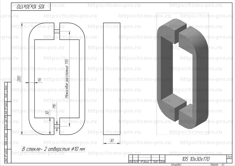 Ручка-скоба двухсторонняя для стеклянных дверей душевых кабин. Отверстия в стекле Ø10-12 мм, межосевое расстояние 170 мм.