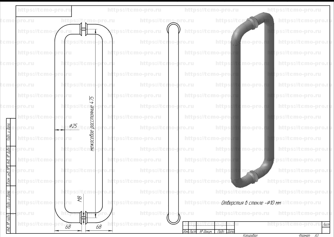Ручка-скоба двухсторонняя для стеклянных дверей душевых кабин, офисных дверей. Отверстия в стекле Ø10-12 мм, межосевое расстояние 475 мм.