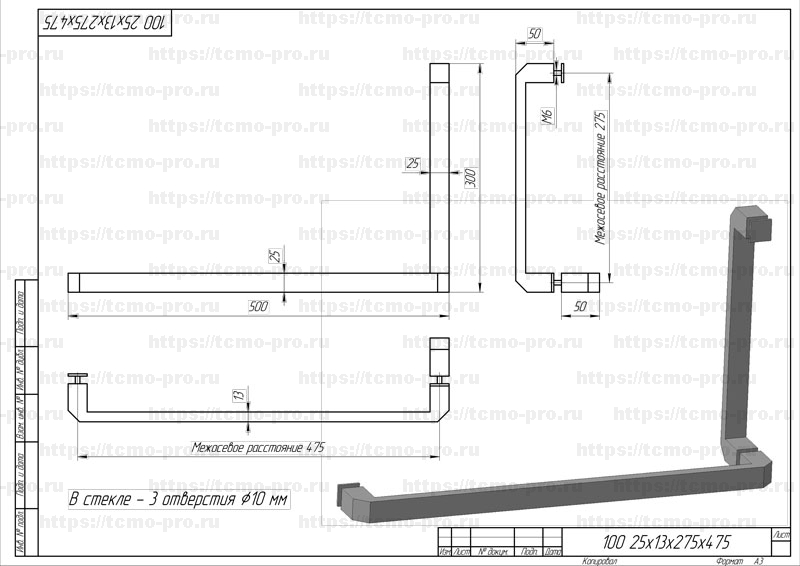Ручка-скоба двухстороняя для душевых кабин из стекла. Может использоваться в качестве полотенцесушителя. Обычно короткая часть устанавливается внутри душевой кабины вертикально, а длинная часть — снаружи горизонтально. Межосевые расстояния 275 мм и 475 мм соответственно. Отверстия в стекле 10-12 мм.