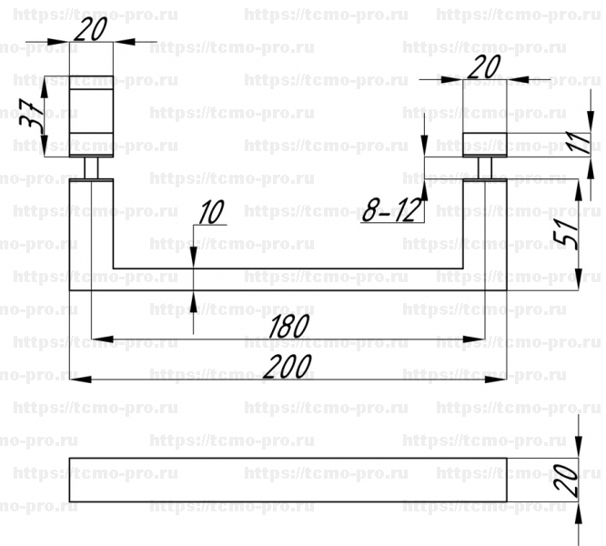 Комбинированная ручка для душевых кабин. Внутри кабины устанавливается ручка-кноб, а снаружи — скоба. Отверстие в стекле Ø10-12 мм. Межосевое расстояние 180 мм.