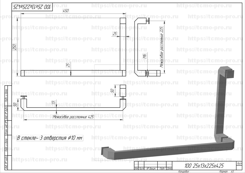 Ручка-скоба двухстороняя для душевых кабин из стекла. Может использоваться в качестве полотенцесушителя. Обычно короткая часть устанавливается внутри душевой кабины вертикально, а длинная часть — снаружи горизонтально. Межосевые расстояния 225 мм и 425 мм соответственно. Отверстия в стекле 10-12 мм.