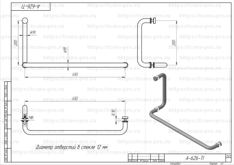 Ручка-скоба для душевых кабин из стекла. Может использоваться в качестве полотенцесушителя. Обычно короткая часть устанавливается внутри душевой кабины вертикально, а длинная часть — снаружи горизонтально. Межосевые расстояния 200 мм и 450 мм соответственно. Отверстия в стекле 10-12мм.