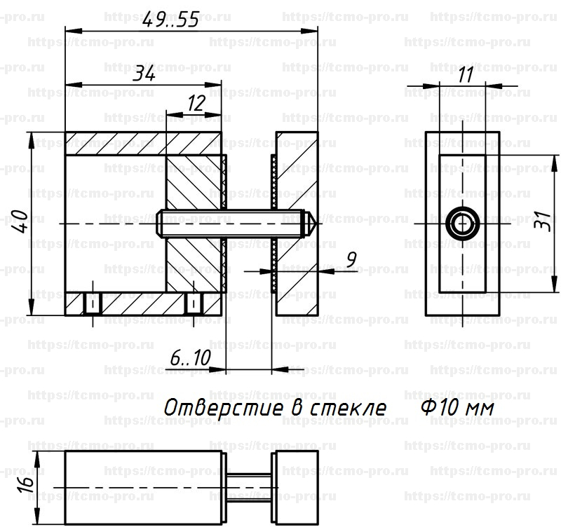 Коннектор предназначен для крепления трубы 30*10 к стеклу через отверстие Ø10 мм под углом 90º. Используется при создании угловых раздвижных перегородок.