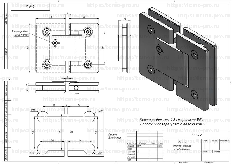Петля с доводчиком. Предназначена для крепления стеклянной двери к стеклянной стенке душевой кабины под углом 180º. Обеспечивает поворот двери в обе стороны на 90º с фиксацией. Имеет регулируемый гидравлический двухскоростной доводчик, возвращающий дверь в исходную позицию. Изделие выполнено из нержавеющей стали AISI 304 без покрытия.