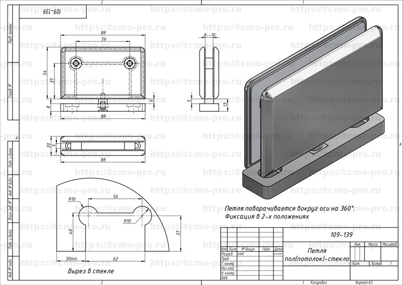 П109-139 петля потолок/пол-стекло поворотная 180º