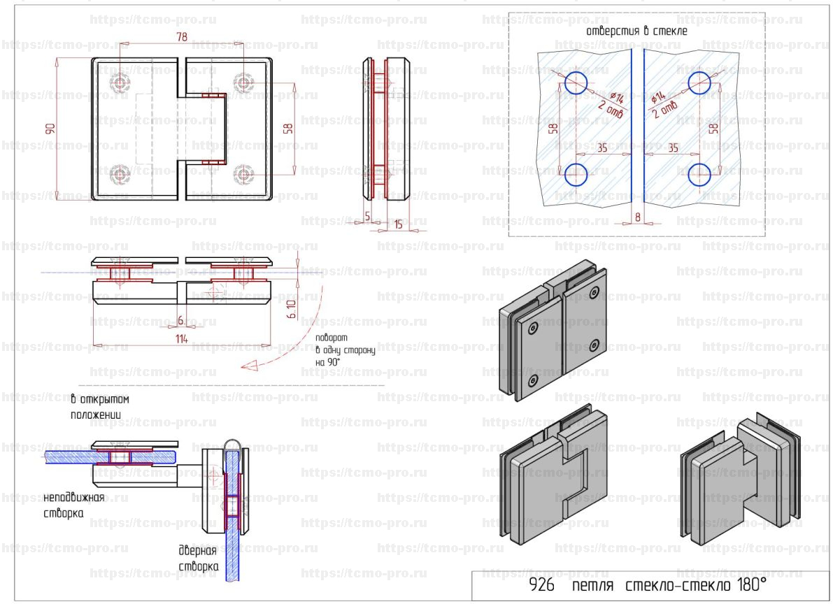 Петля предназначена для крепления стеклянной двери душевой кабины к неподвижной стеклянной стенке душевой под углом 180º. Обеспечивает открывание двери в одну сторону (наружу) на 90º с фиксацией. Не требует разреза в уплотнителях. Изделие выполнено из нержавеющей стали AISI 304 без покрытия