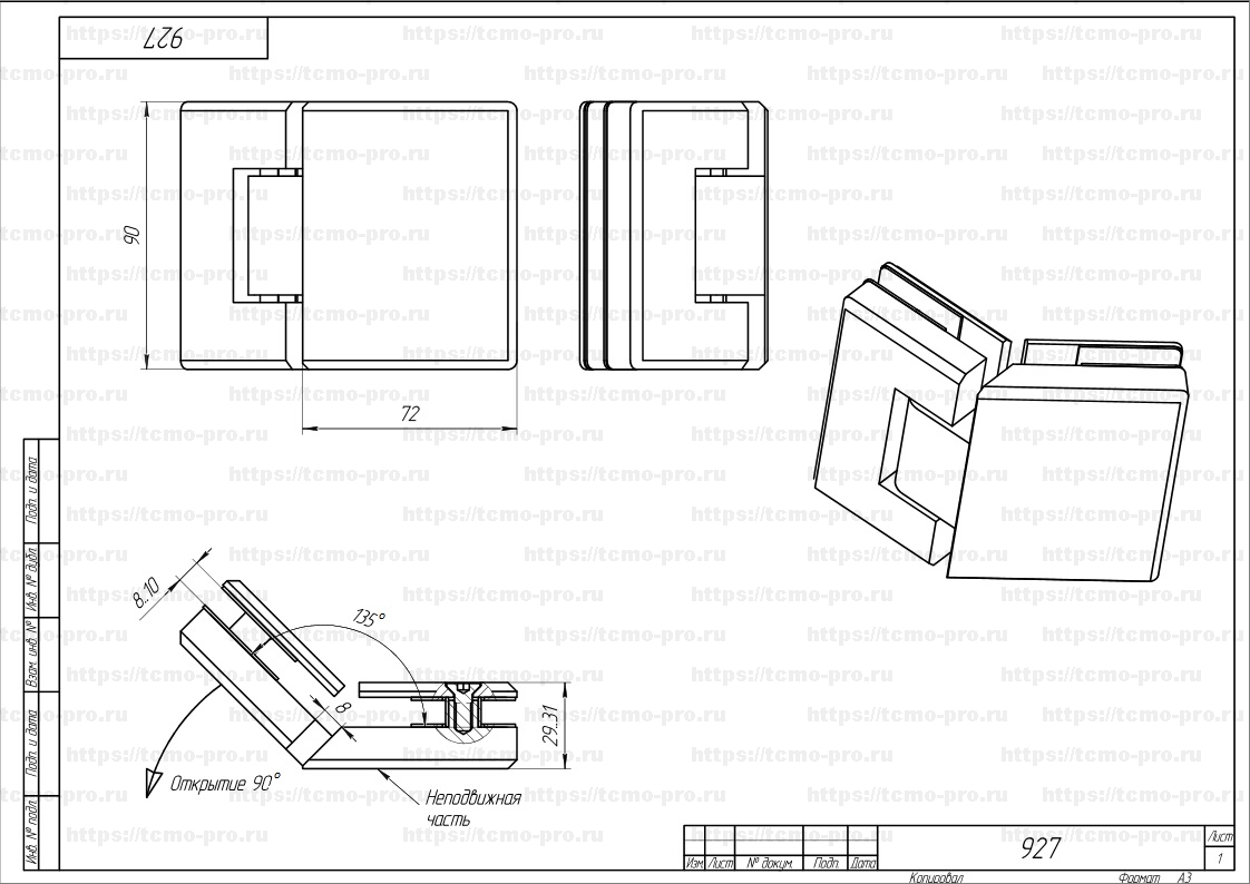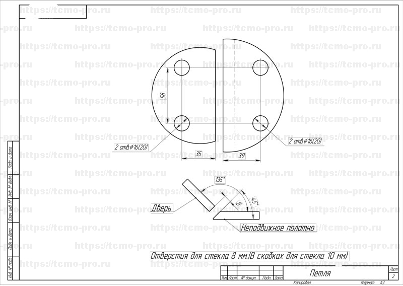 Петля предназначена для крепления стеклянной двери на стеклянную перегородку душевой кабины под углом 135º. Обеспечивает открывание двери в одну сторону (наружу) на угол 90º с фиксацией. При меньшем угле поворота срабатывает самозакрывание. Не требует разреза в уплотнителях. Изделие изготолвено из нержавеющей стали AISI 304 без покрытия.