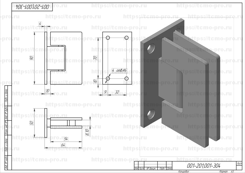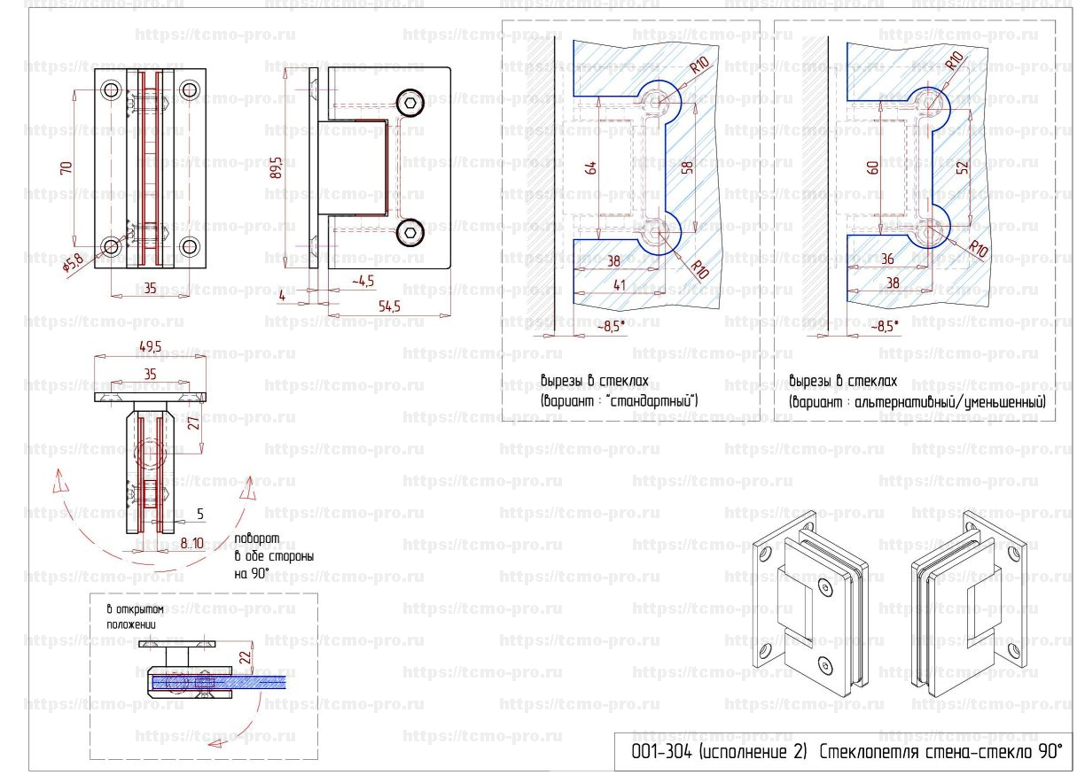 Петля предназначена для крепления стеклянной двери душевой кабины к стене. Обеспечивает поворот двери в обе стороны на 90º. Материалом изготовления является нержавеющая сталь AISI-304. Без покрытия. Без фаски.