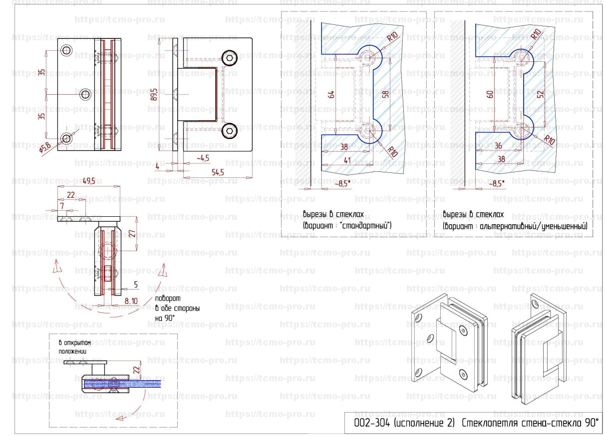 Петля предназначена для крепления стеклянной двери душевой кабины к стене. Обеспечивает поворот двери в обе стороны на угол 90°. Изготовлена из нержавеющей стали AISI-304. Без покрытия. Без фаски.