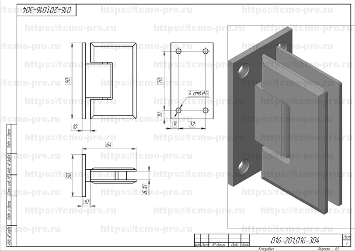 Петля со смещённой площадкой. Предназначена для крепления стеклянной двери душевой кабины к стене под углом 90º. К стене крепится с двух сторон. Обеспечивает поворот двери в обе стороны на угол 90º с фиксацией. При открывании двери на меньший угол срабатывает функция самозакрывания. Петля изготовлена из нержавеющей стали AISI 304 без покрытия, с фаской.