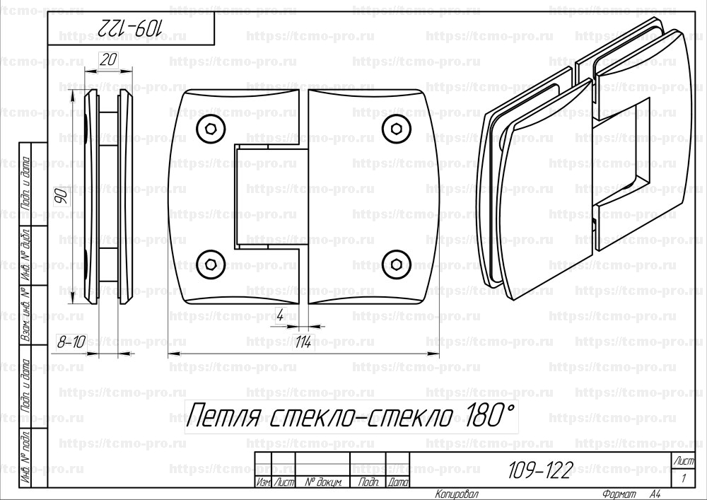 Петля предназначена для установки стеклянной двери на стеклянное полотно душевой кабины под углом 180°. Дверь может открываться на угол 90° в каждую сторону с фиксацией. При открытии на меньший угол, дверь возвращается в исходное положение. Элегантное стилевое оформление изделия отличается от дизайна стандартных петель.