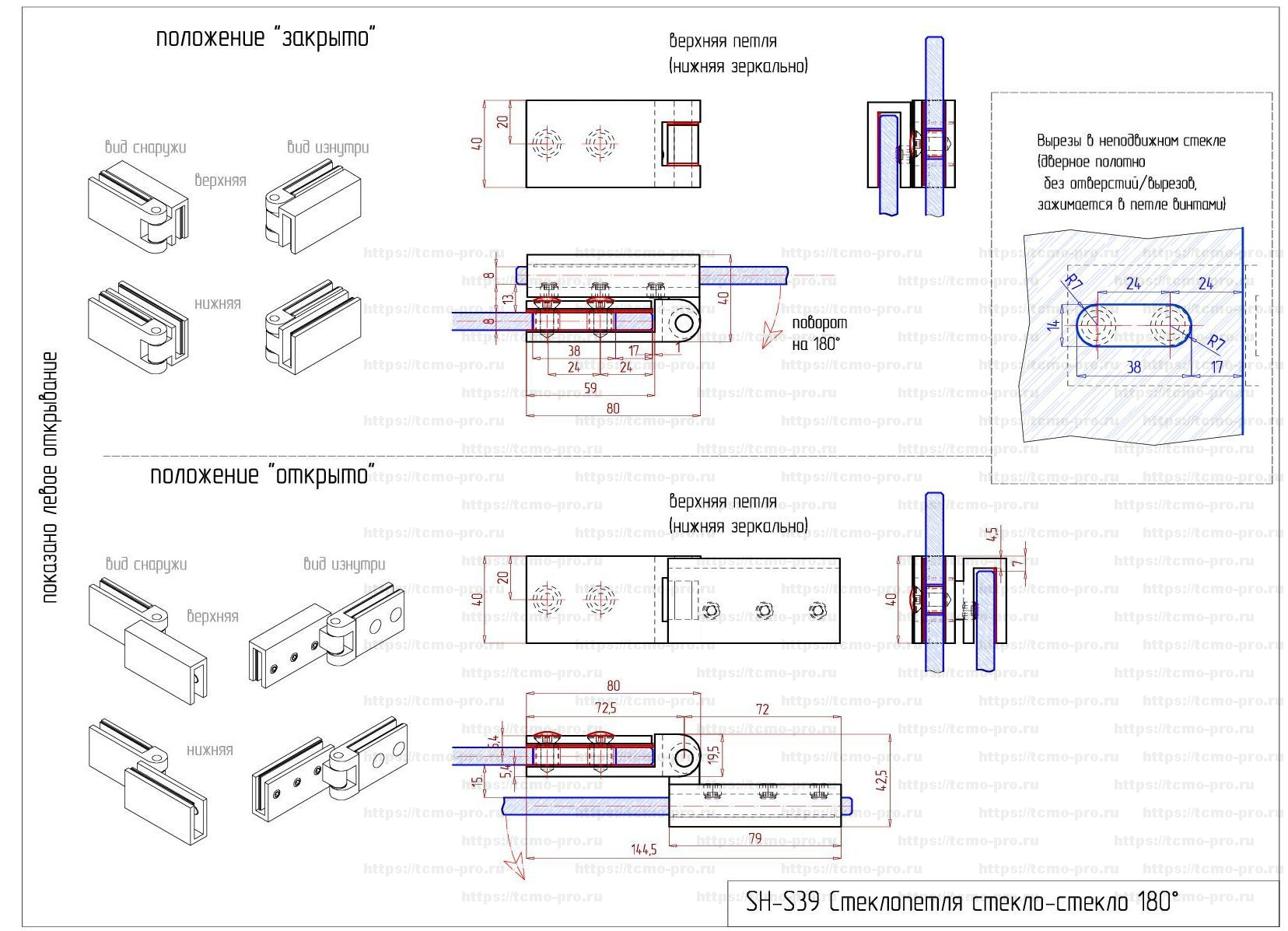 SH-S39 Стеклопетля glass-glass 180°, Left+Right, Size:80*42*40mm