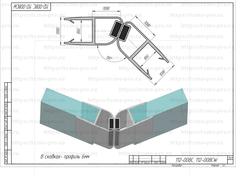 Профиль предназначен для уплотнения дверей душевых кабин, расположенных под углом 135º. Может устанавливаться так же под углом 180º.