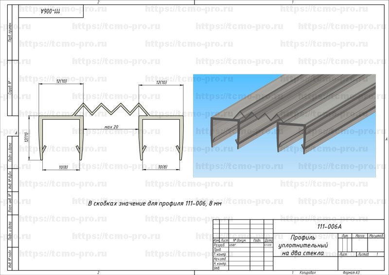 Профиль предназначен для уплотнения подвижных и неподвижных соединений стекол, расположенных под произвольным углом между собой. Рассчитан на стекло толщиной 10 мм. Длина профиля 2,2 метра.