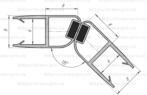 Профиль предназначен для уплотнения дверей душевых кабин, расположенных под углом 135º. Рассчитан на стекло толщиной 6 мм. Длина профиля 2,2 метра.