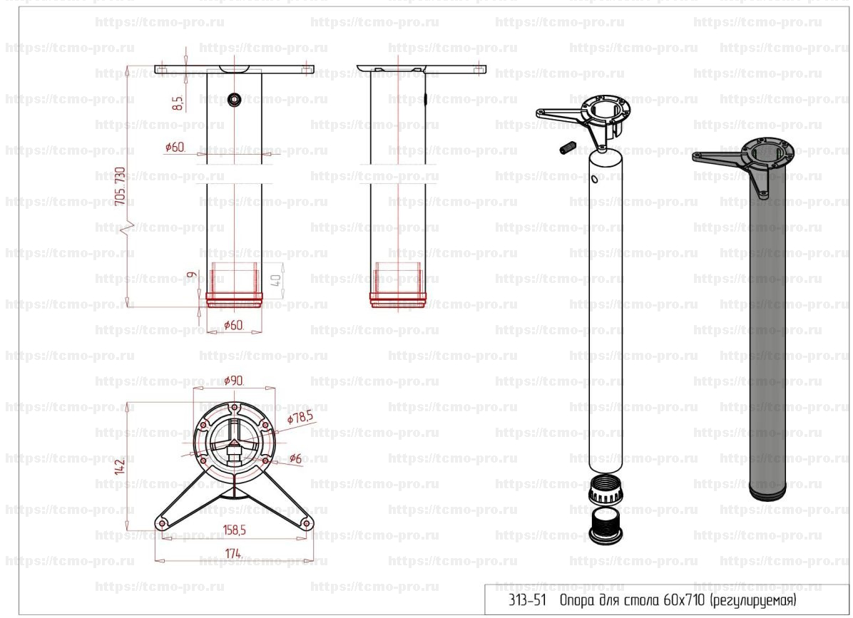 SND313-51 Опора ножка для стола 60х0,8х710мм с алюминиевой накладкой