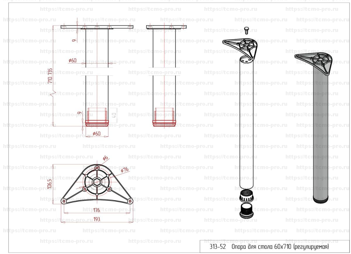 SND313-52 Опора ножка для стола 60х0,8х710мм хром с алюминиевой накладкой
