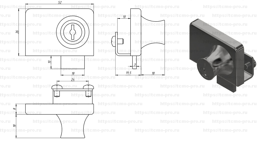 Замок с ручкой для стеклянной витрины. Гнездо замка встроено в ручку. Замок устанавливается без высверливания отверстий в стекле.