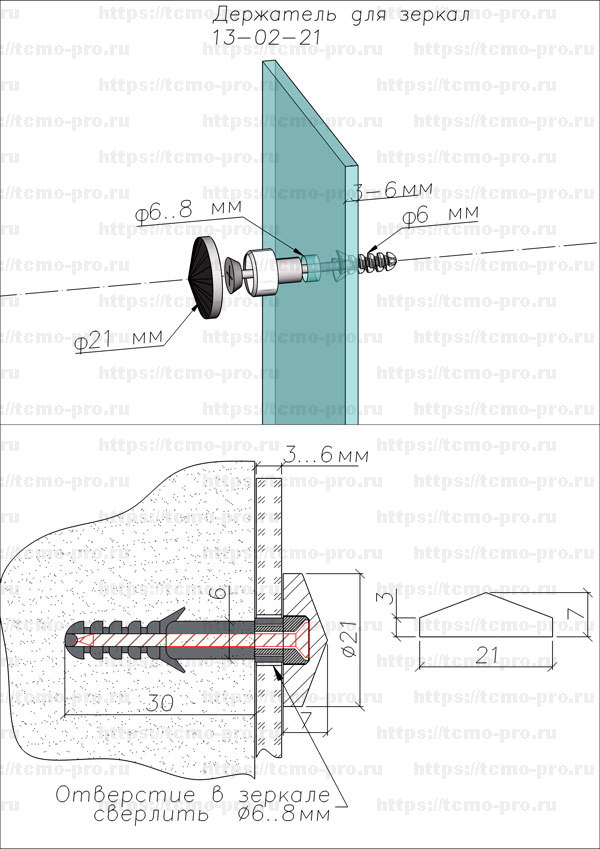 Конусообразное крепление зеркала. Толщина зеркала 4-8 мм, диаметр детали 21 мм. Для удобства монтажа крепление конус комплектуется пластиковой втулкой диаметром 5.9 мм. В комплекте есть дополнительная латунная шайба с резьбой.