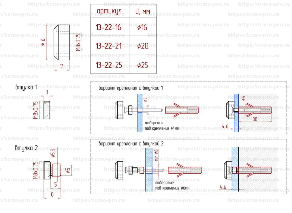 Крепление Пирамида для установки зеркала. Предполагает высверливание отверстий в стеклянном полотне. Толщина зеркала 4-8 мм, диаметр детали 25 мм. Втулка 5,9 мм.