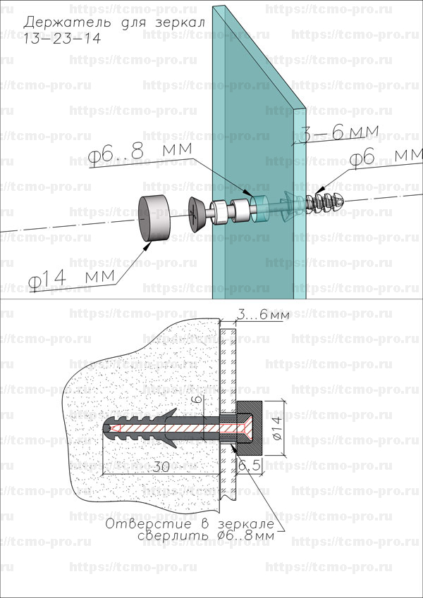 Крепление Классика для зеркала толщиной 4-8 мм. Предполагает высверливание отверстия в зеркале. Диаметр детали 14 мм.