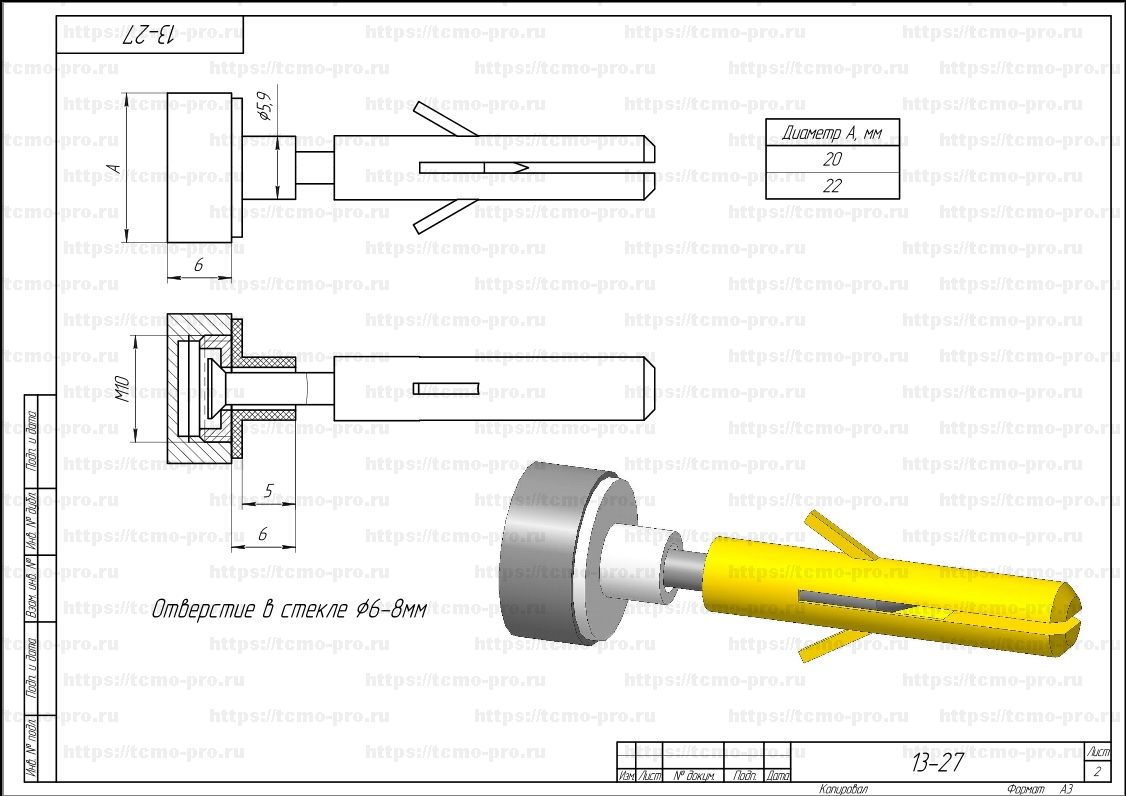 Крепление для зеркала или рекламной таблички толщиной 8-10 мм. Предполагает высверливание отверстия в зеркале/стекле. Диаметр детали 22 мм.