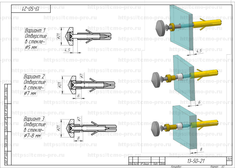 Крепление для зеркала/стекла (скинали) толщиной 4-8 мм. Предполагает высверливание отверстия 8 мм в зеркале/стекле. Диаметр детали 21 мм. Комплектуется тремя втулками 4-5 мм 6 мм и 8 мм..