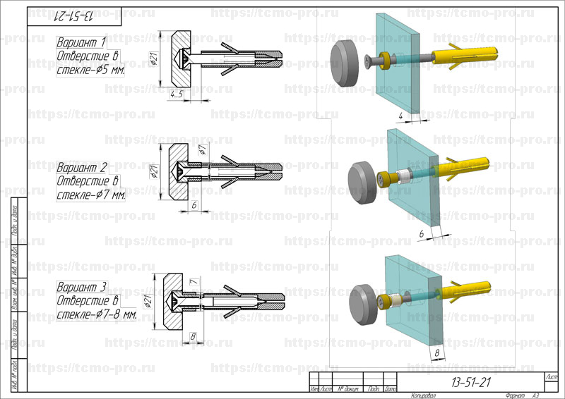 Крепление для зеркала/стекла (скинали) толщиной 4-8 мм. Предполагает высверливание отверстия 6-8 мм в зеркале/стекле. Диаметр детали 21 мм. Комплектуется тремя втулками 4-5 мм и 6 мм и 8 мм.