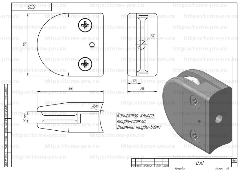 Коннектор позволяет закрепить стеклянную перегородку на трубе без высверливания отверстий в стекле. Выемка на торцевой части коннектора позволяет устойчиво закрепить его на трубе. Стекло размещается и удерживается между специальными прокладками, защищающими стекло от повреждений в местах соединения с коннектором.