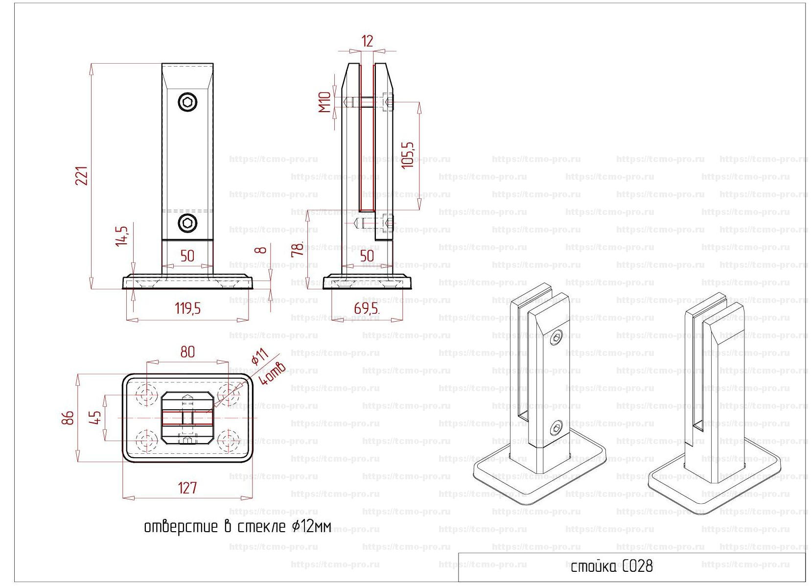 C028 Стойка (министойка) для стеклянных ограждений 221мм