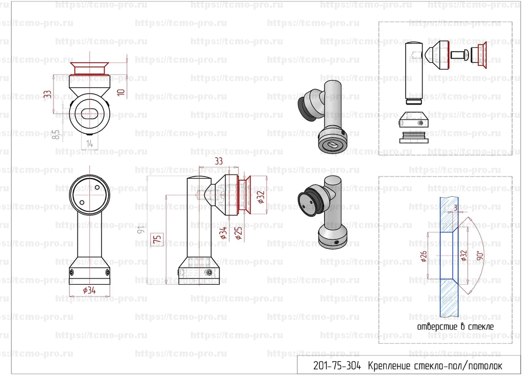 201-75-304 Крепление стекло-пол/потолок 75 мм
