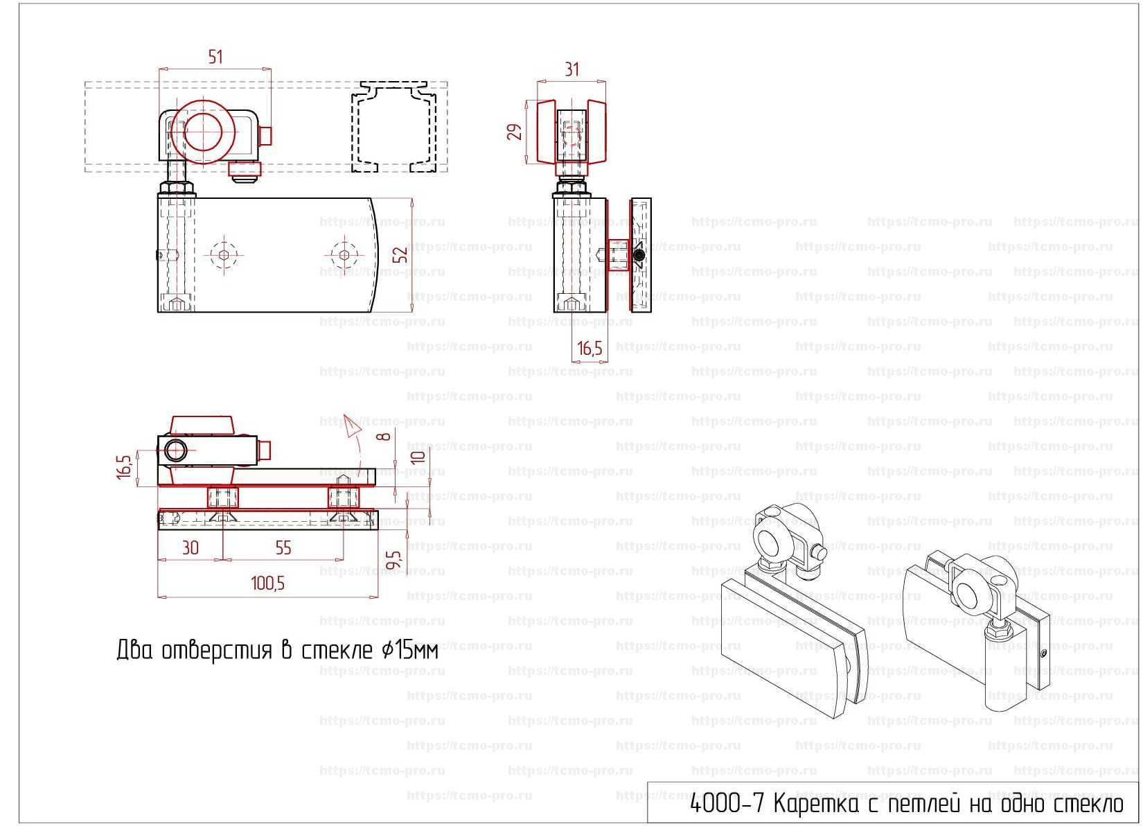 SND4000-7 Каретка с петлей на одно стекло