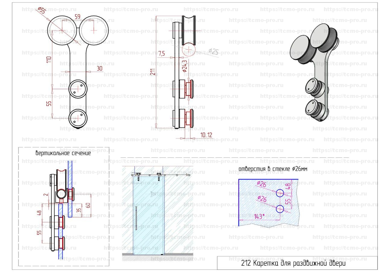 Каретка для раздвижной двери серии "Вектор" с креплением к стеклу без зенковки и плоской пластиной и двойным роликом.Нагрузка на одну каретку до 50 кг.