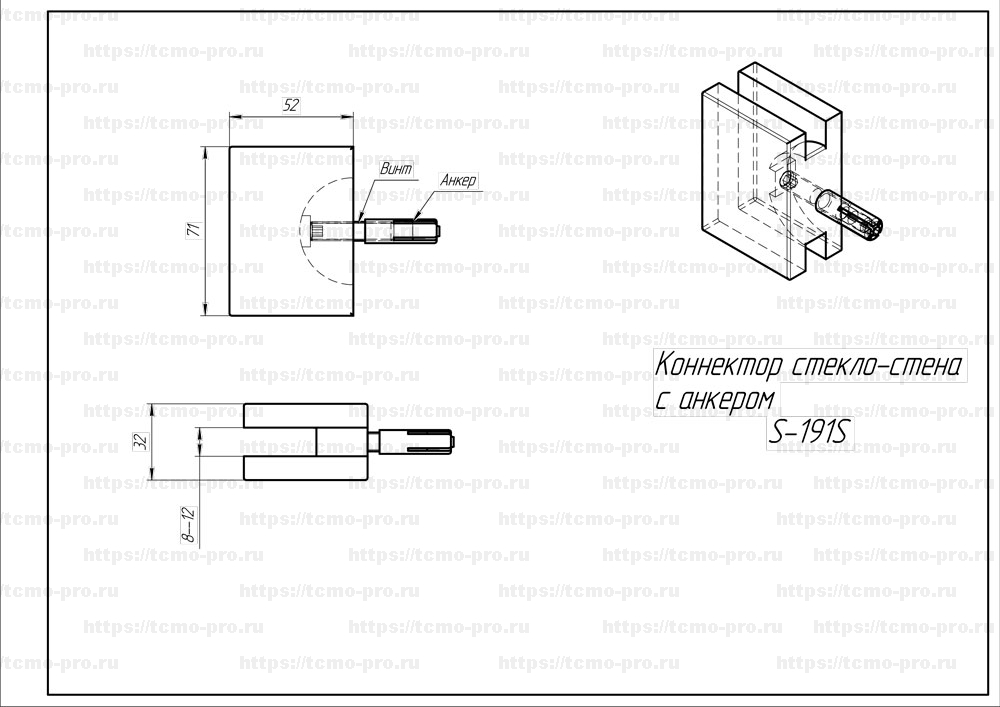 Модель S-191S представляет собой коннектор для крепления неподвижных стекол межкомнатных перегородок маятниковой системы "Классика" к стене.