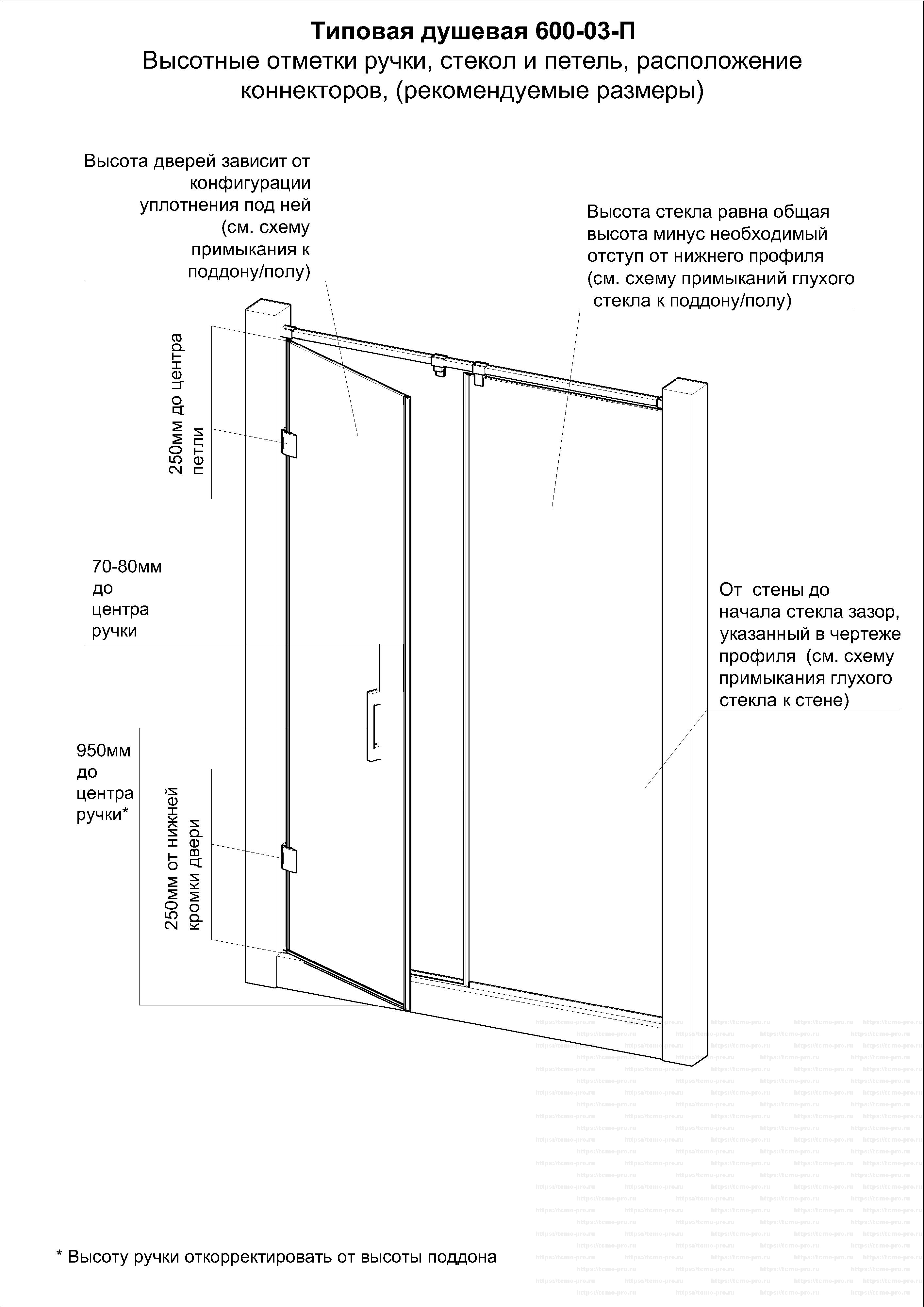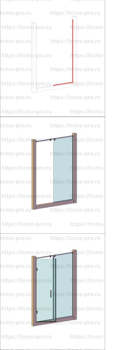 Под место где будут установлена дверь проложите подкладки нужной толщины. Монтаж петли на стёкло и стену смотрите непосредственно в чертеже самой петли, предоставленной на сайте.