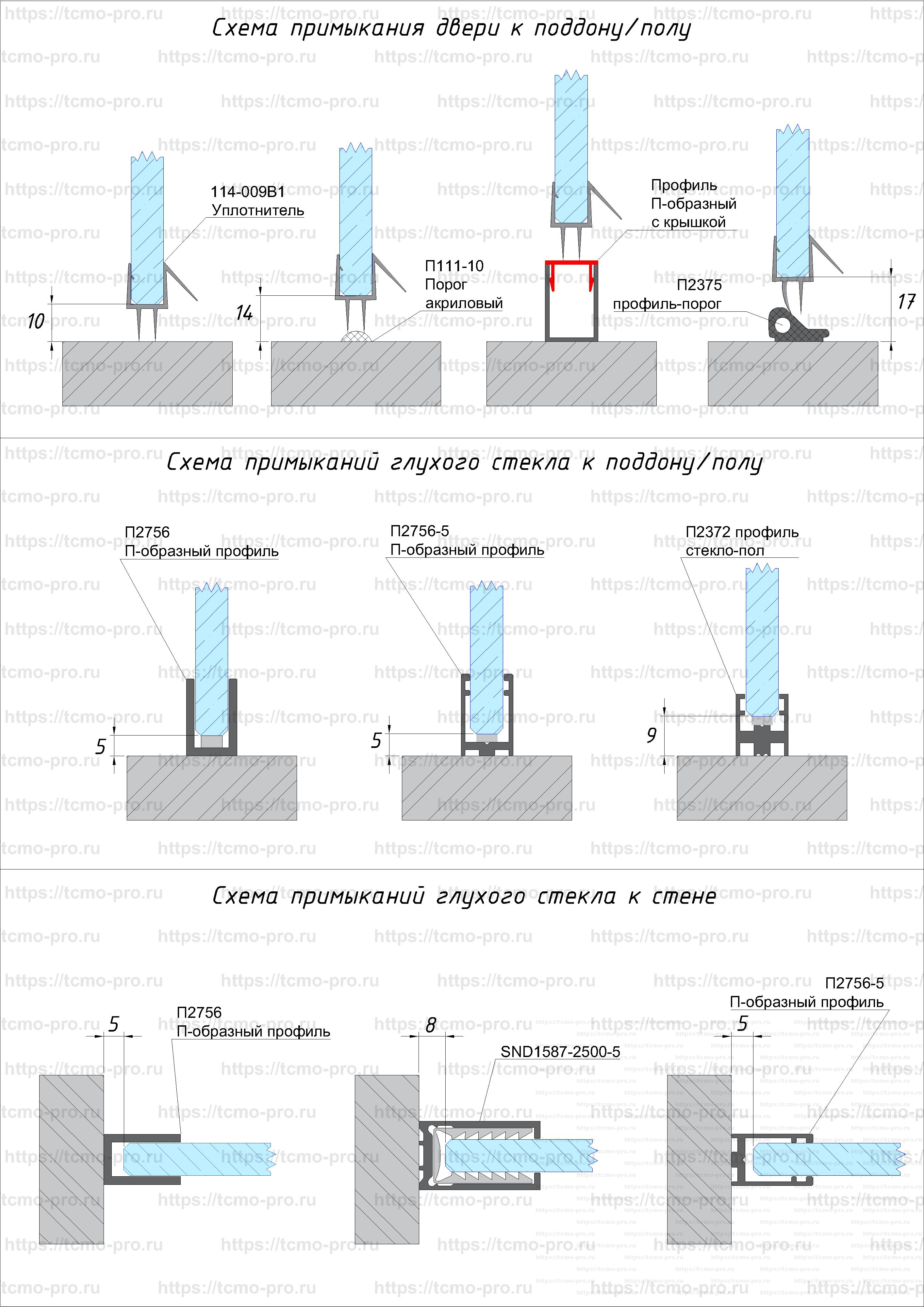 Схемы примыканий стекла к полу и стене |