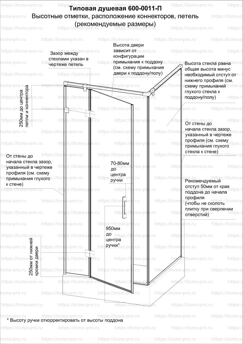 Под место где будет установлена дверь проложите подкладки нужной толщины. Придерживая дверь, закрутите петли через вырезы/отверстия в стекле, надёжно зафиксируйте. Монтаж петли на стёкла смотрите непосредственно в чертеже самой петли, предоставленной на сайте.