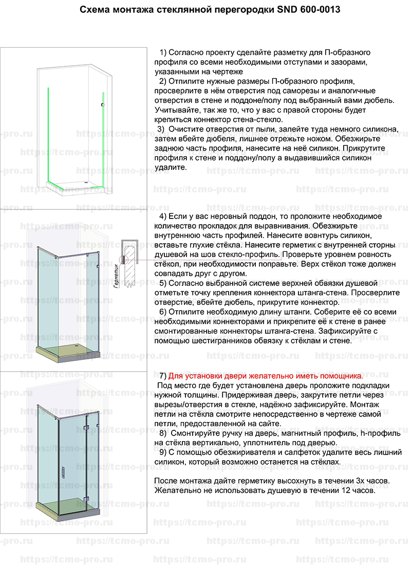 После монтажа дайте герметику высохнуть в течении 3х часов. Желательно не использовать душевую в течении 12 часов.