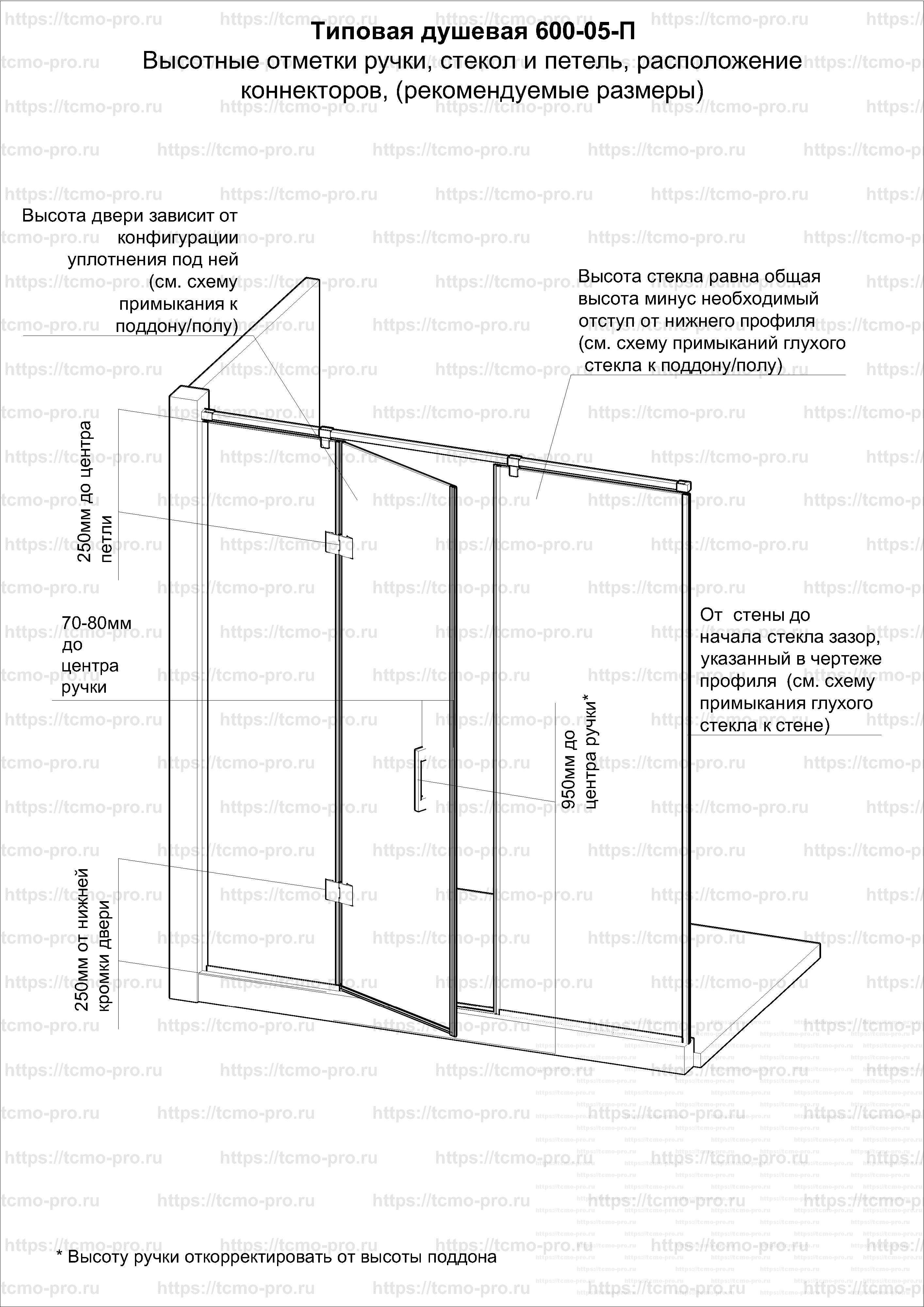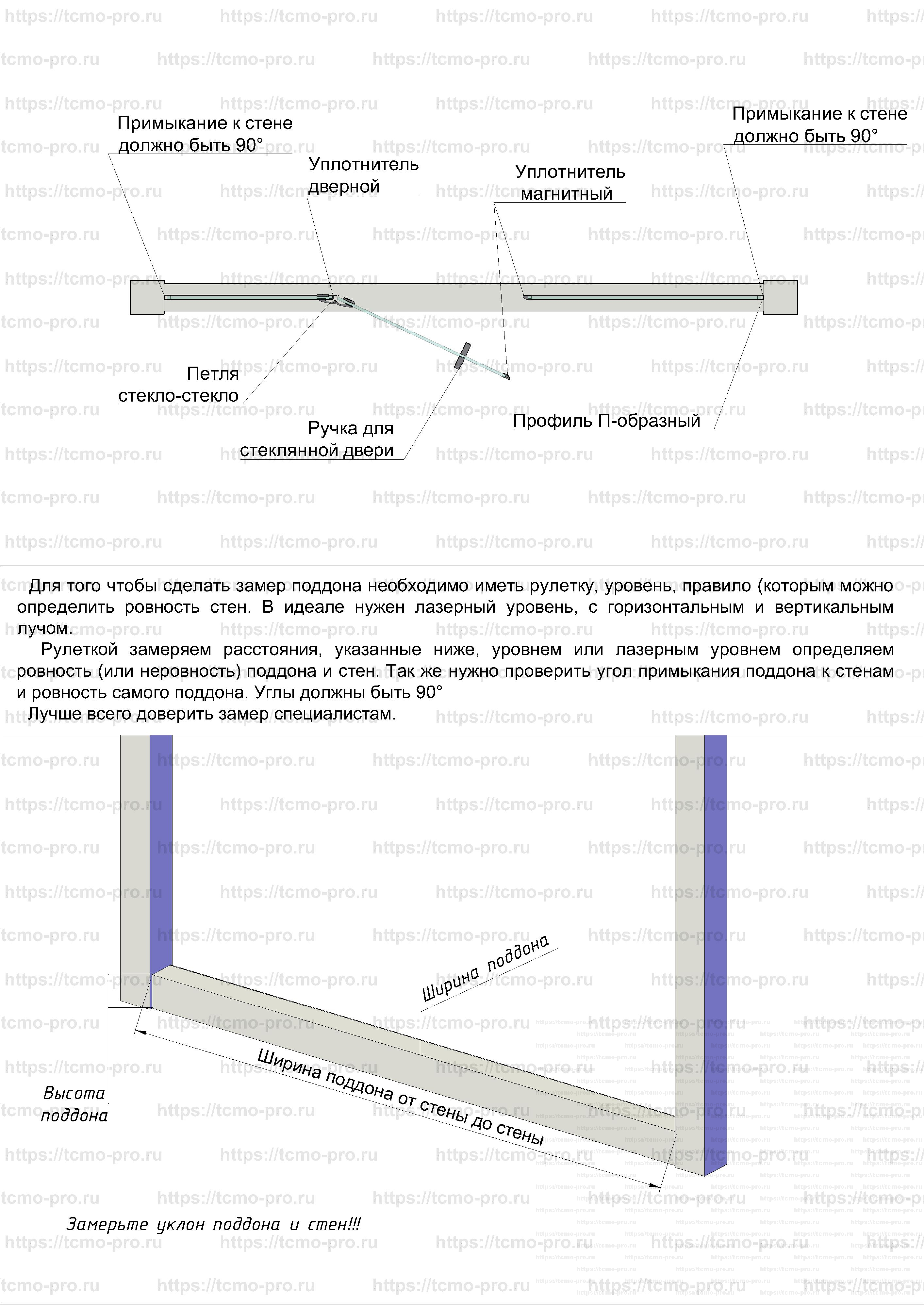 Под место где будут установлена дверь проложите подкладки нужной толщины. Монтаж петли на стёкло и стену смотрите непосредственно в чертеже самой петли, предоставленной на сайте.