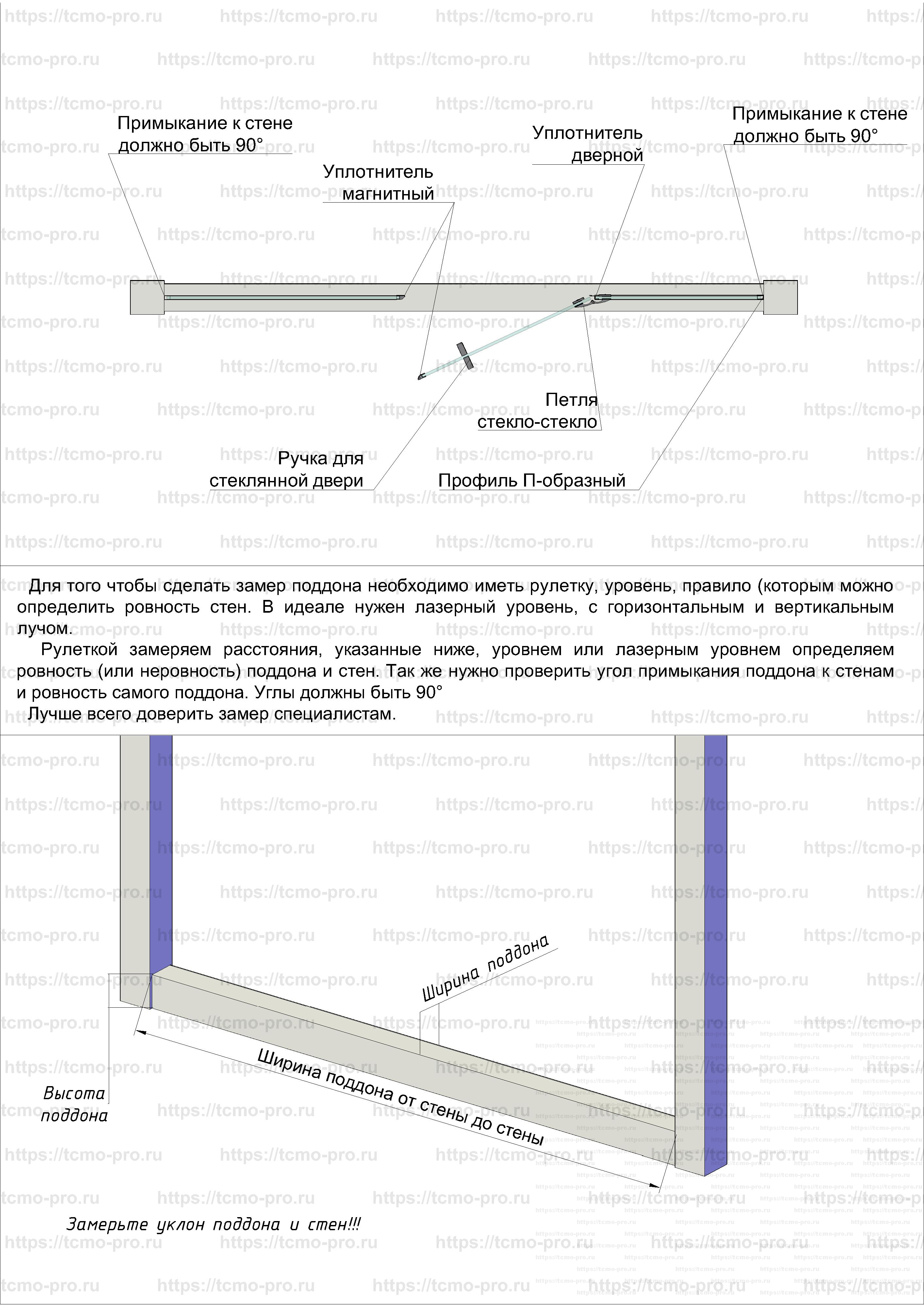 Под место где будут установлена дверь проложите подкладки нужной толщины. Монтаж петли на стёкло и стену смотрите непосредственно в чертеже самой петли, предоставленной на сайте.