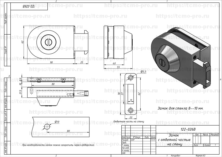 Замок стена-стекло для стеклянных дверей толщиной 8-10 мм. Особенности конструкции запорного механизма позволяют использовать на раздвижных дверях. Крепление замка возможно без сверления отверстий в стекле, но наилучший результат достигается при монтаже через отверстие. В комплекте-ответная часть на стену.